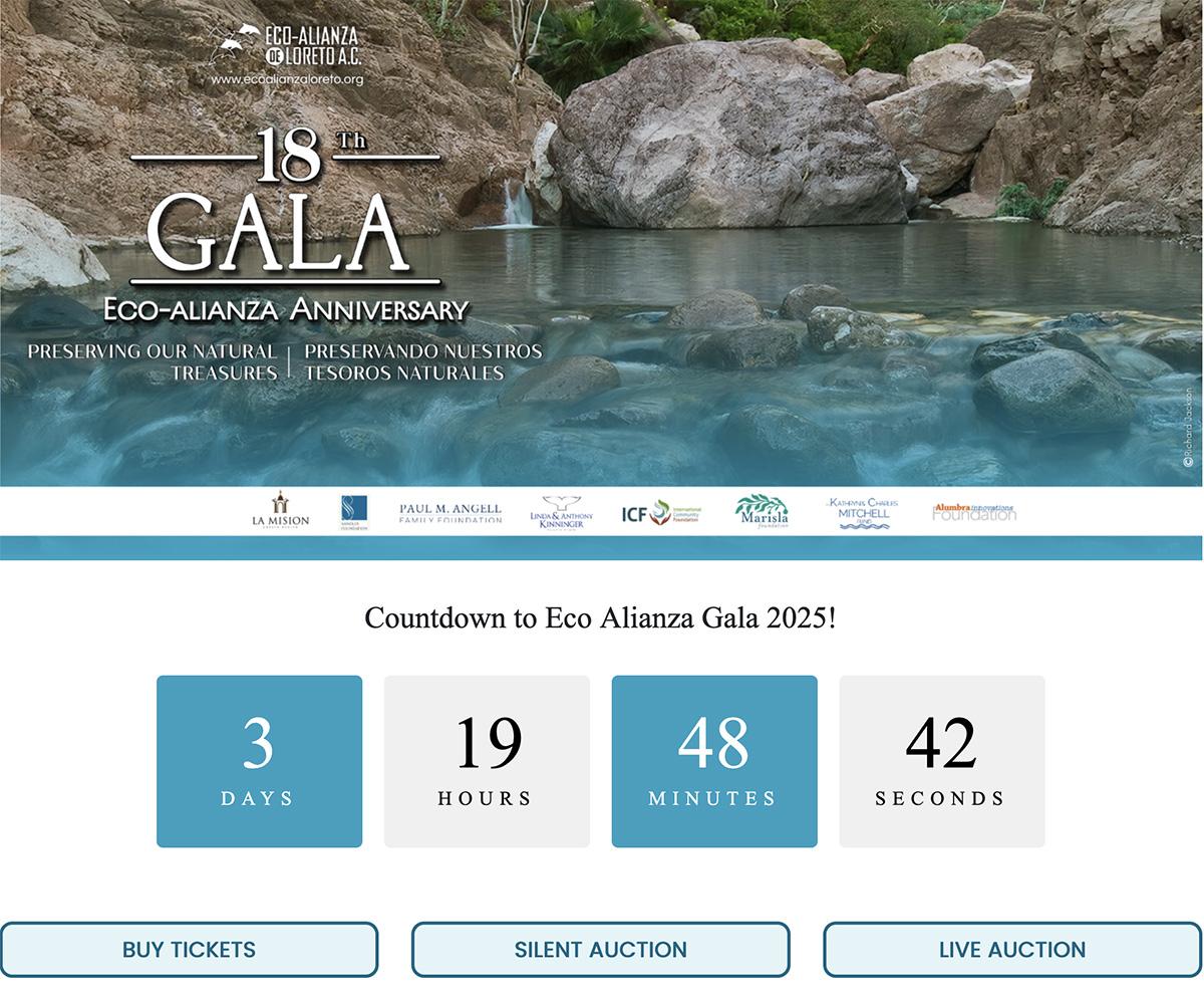 La GALA de Subasta en Vivo de Eco-Alianza de este año promete más aventuras, experiencias y emoción que nunca. Aquí hay un pequeño adelanto de lo que podría ser suyo: Tour en Catamarán a las Islas Danzante y Del Carmen, Estancia en Casita en el Mar de Cortés, Cena Fiesta Mexicana en Rancho El Jaral para 10 personas, Aventura en ATV para 4 personas, y mas....